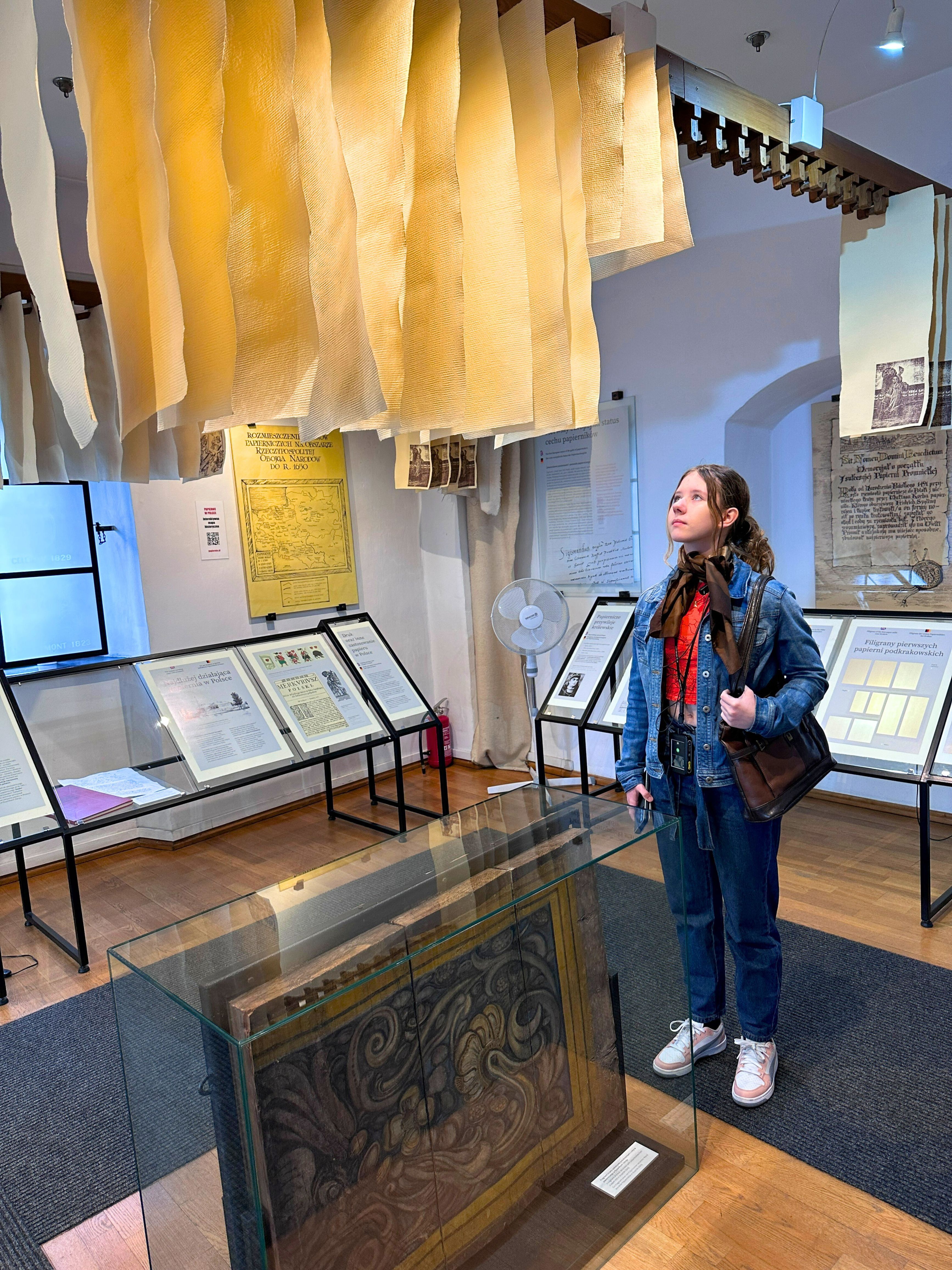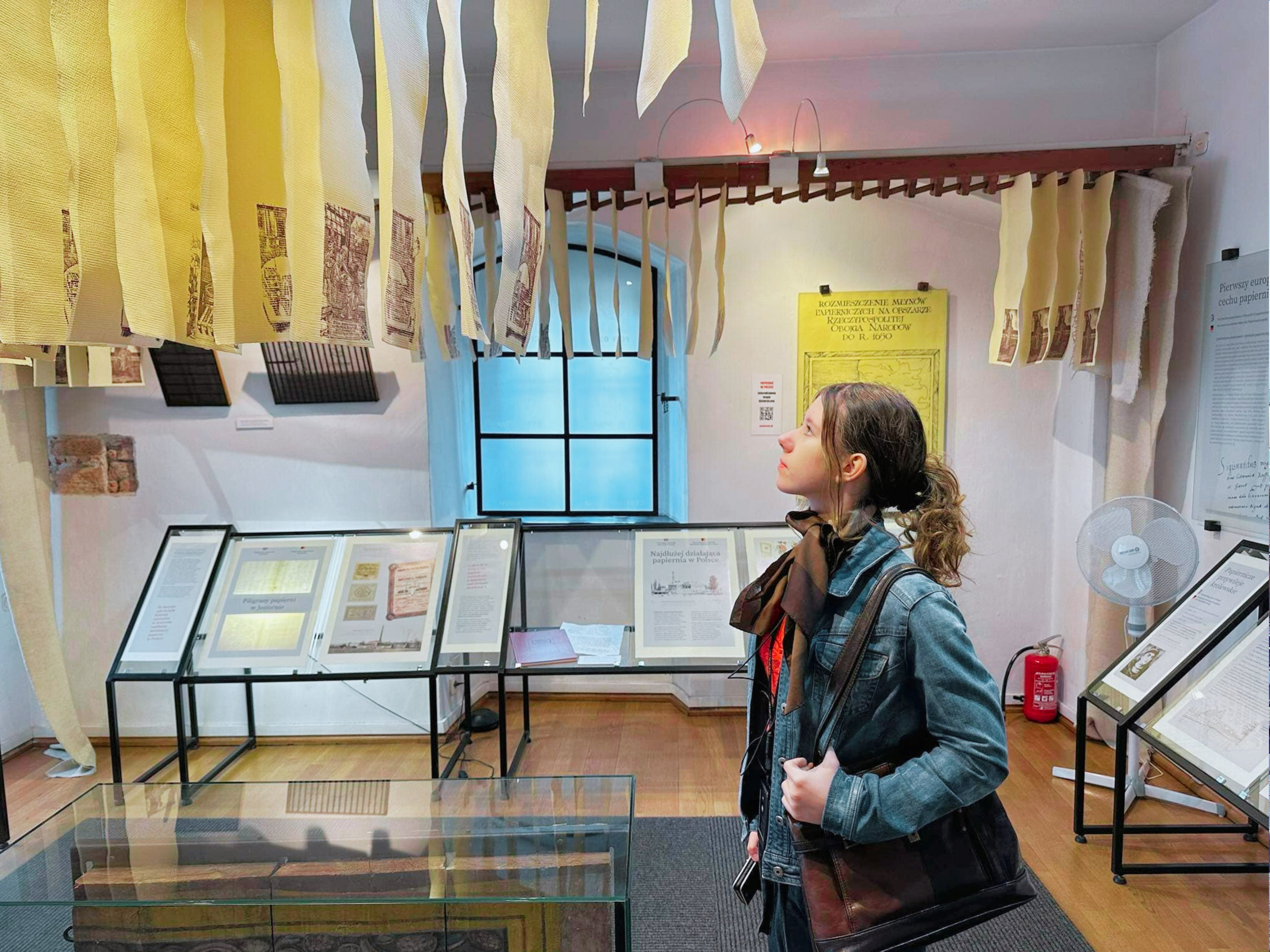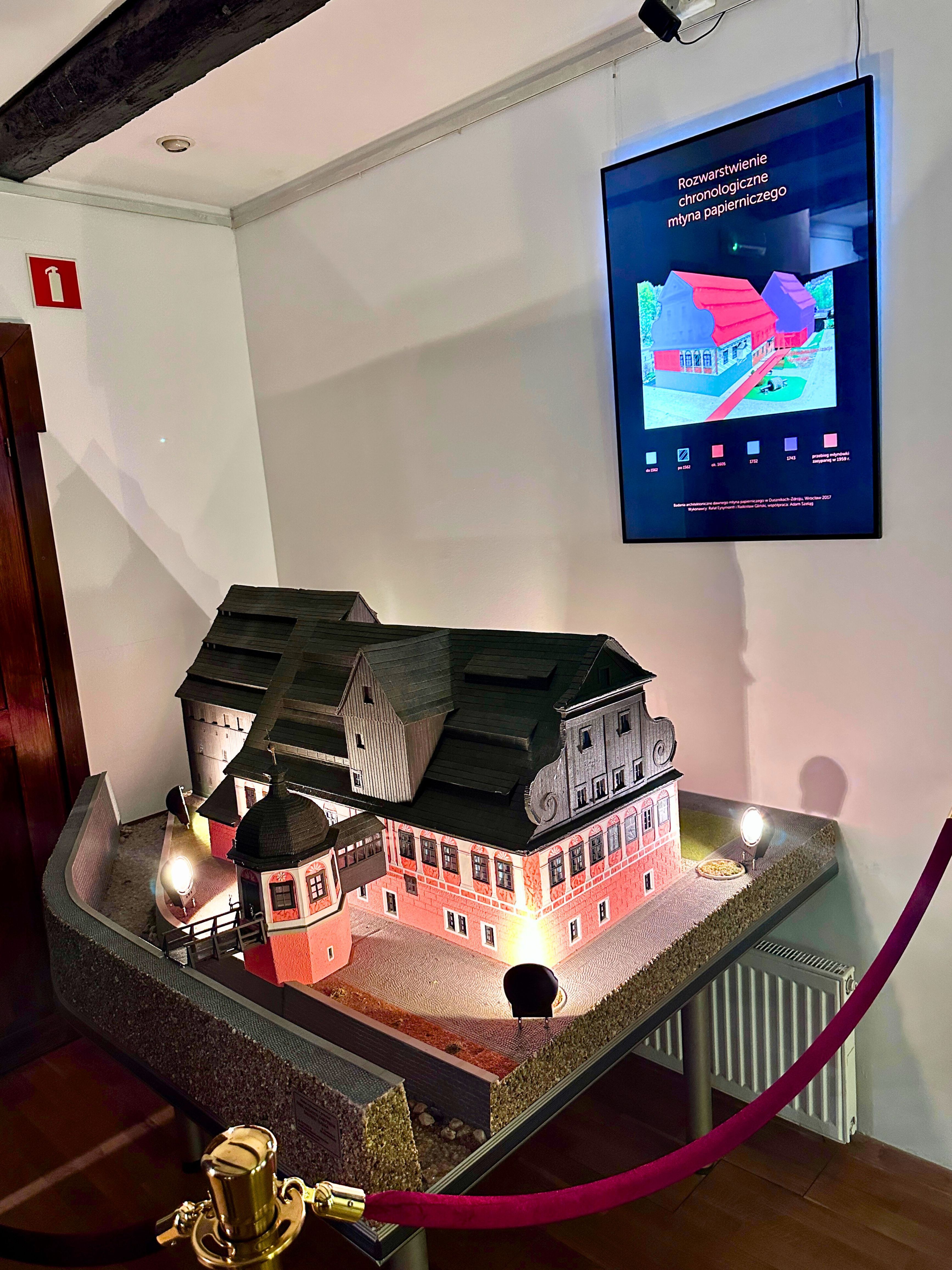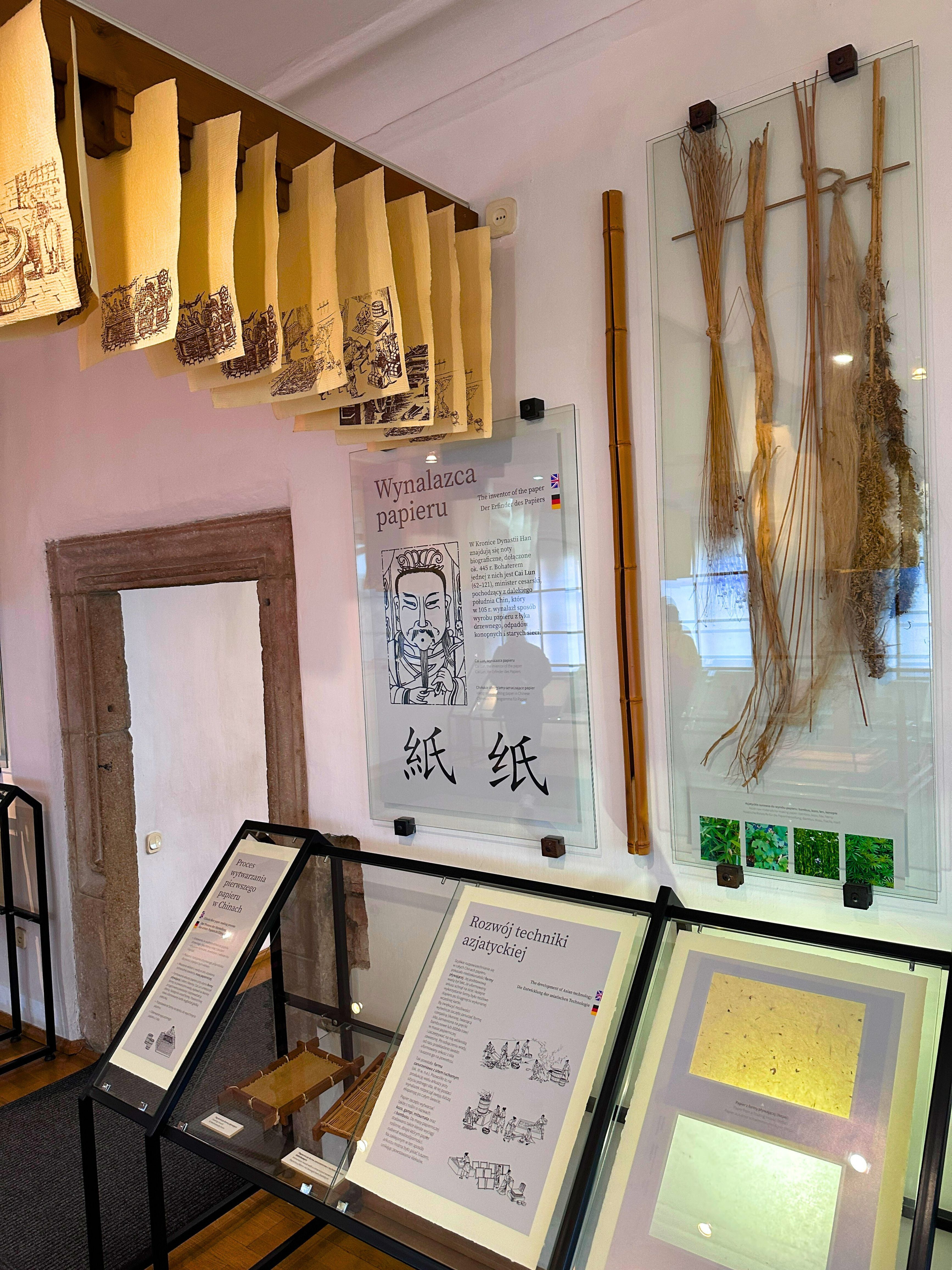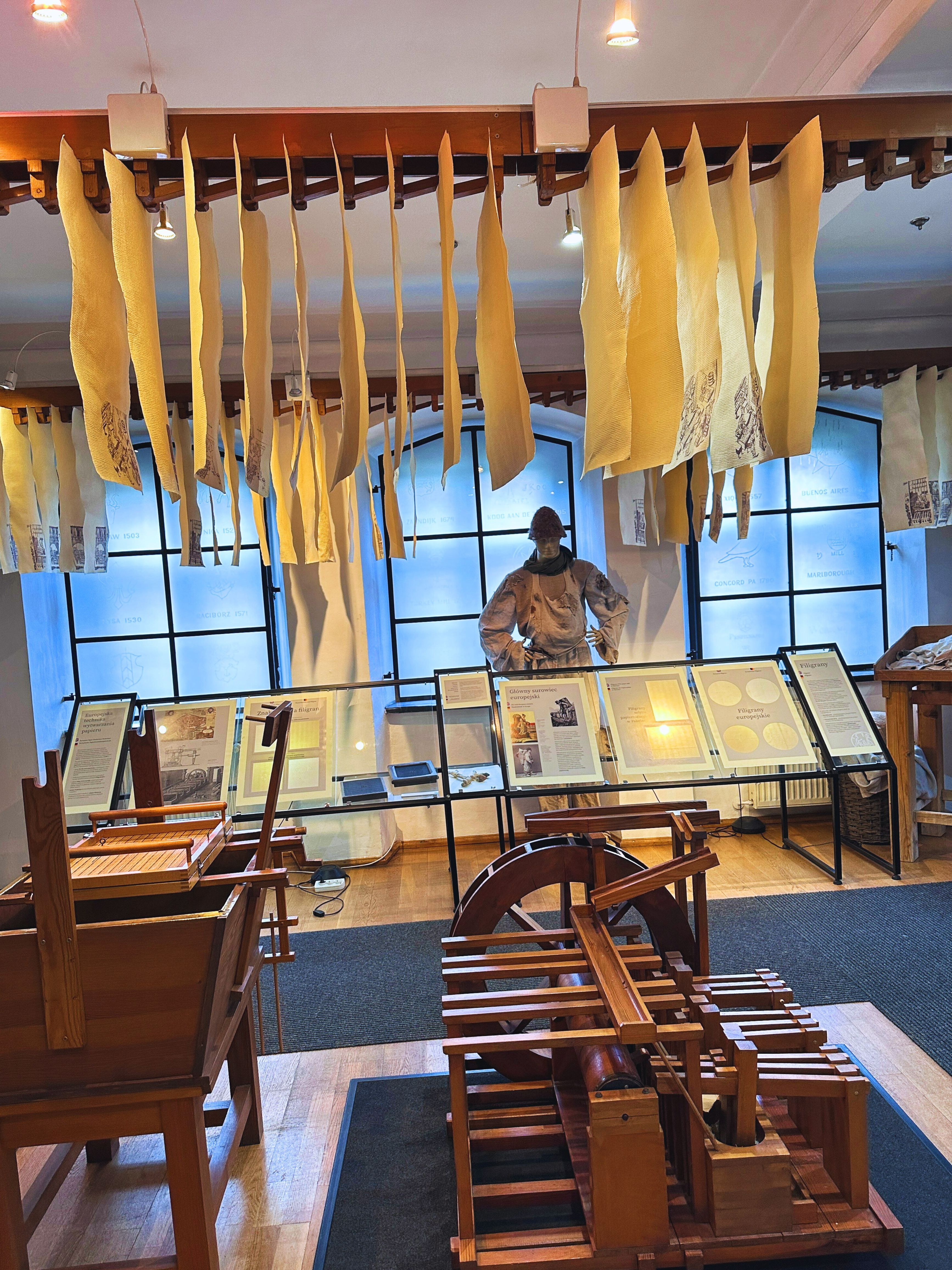 Idąc dalej trafiamy na wystawy poświęcone powstaniu tego budynku, a w słuchawkach leci nam historia jego właścicieli. Następnie mamy w gablotach pokazane materiały, z których wytwarza się papier, a także maszyny do jego produkcji, jak i również maszyny do druku. W ostatniej z sal za szybką, możemy zobaczyć zeszyty, origami itp.